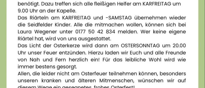 Liebe Seidfelderinnen & Seidfelder, Ostern steht vor der Tür und damit auch unser alljährliches Osterfeuer. Vorab daher ein paar Infos für Euch. Es werden wieder fleißige Hände bei der Aufschichtung des Feuers benötigt. Dazu treffen sich alle fleißigen Helfer am Karfreitag um 9.00 Uhr an der Kapelle. Das Riärteln am …