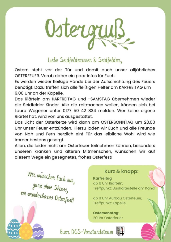 Das Riärteln am Karfreitag und -samstag übernehmen wieder die Seidfelder Kinder. Alle die mitmachen wollen, können sich bei Laura Wegener melden. Wer keine eigene Riärtel hat, wird von uns ausgestattet.